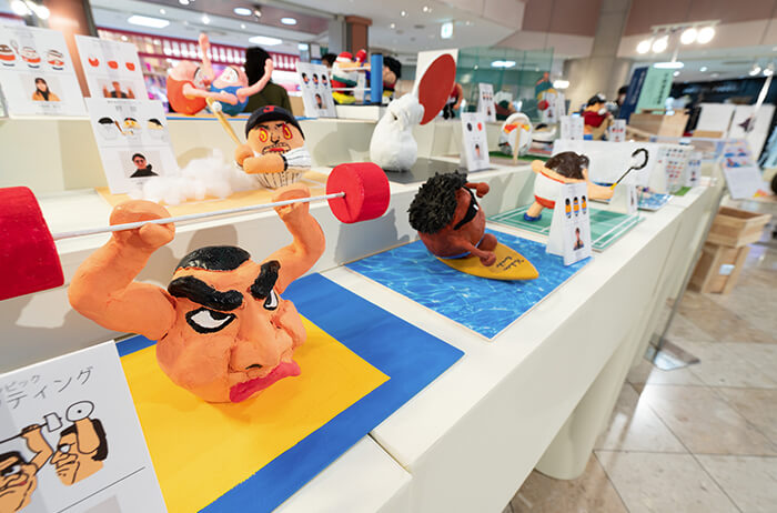 芸術学部では福岡市の伝統工芸品のデザイン支援活動に取り組んでいます。2019年度は「博多張子」で、粘土で製作した型の上に和紙を重ね張りして製作されます。博多張子の人形師 三浦隆氏の指導のもと、ダルマ人形をベースに20名の学生が、20のオリンピック種目を自由に表現しました。製作した博多張子は、九産大プロデュース展の会場に展示し、来場者の人気投票で「水泳」が最も票を集めました。